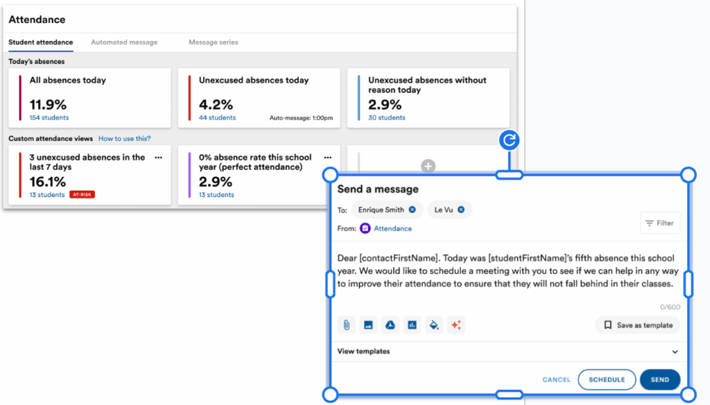 For staff, a centralized Attendance Inbox keeps all communication organized and translated, while Automated Daily Absence Messages notify families when a student misses school. Personalized outreach guided by data helps teams save time, reduce phone tag, and build trust.