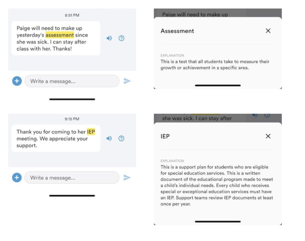 TalkingPoints recognizes that not all family members have experience with the US educational system – that’s where Ed101 comes in. Families on the TalkingPoints for Families app see education-specific terms highlighted in their messages. Families are supported with definitions of these terms, which are written to cater to lower literacy levels – ensuring they’re easily understandable. For example when teachers send through terms like “IEP”, “field trip”, or “sub”, the app highlights and defines them to prevent any feelings of embarrassment or confusion that might break down communication