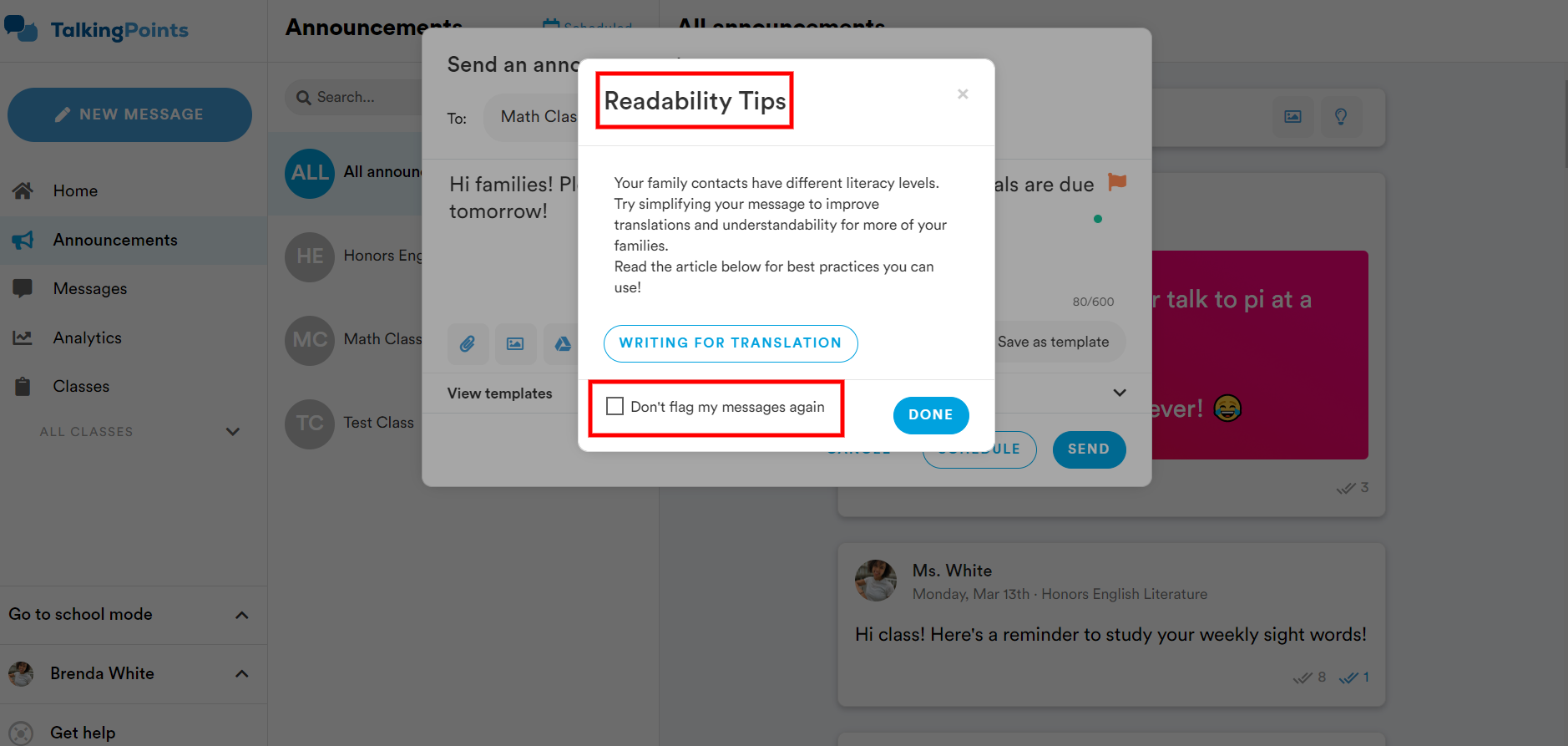 In addition to literacy considerations on the TalkingPoints for Families app, the TalkingPoints for Teachers web experience supports composing announcements that will be understandable to all families.
